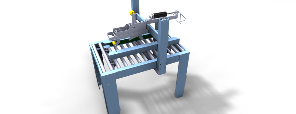 Equipo de fin de linea para el cerrado mediante cinta adhesiva por la parte inferior y superior, estos equipos pueden estar integradados directamente en líneas de proceso o maquinas customizable